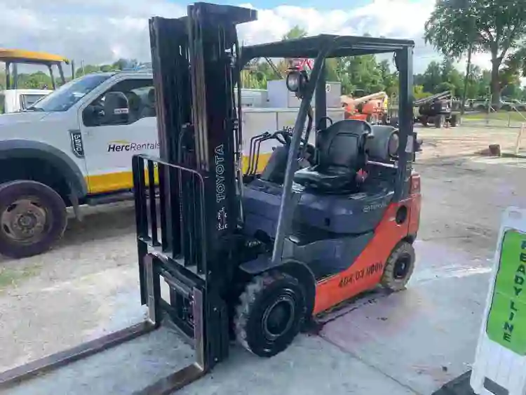 Toyota forklift 2400 lbs side shift, Model 8FGU18, propane-powered with 2543 hours. This solid tire forklift is in used condition, offering robust performance for various warehouse needs. Compact and reliable for optimal maneuverability.